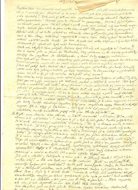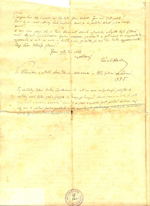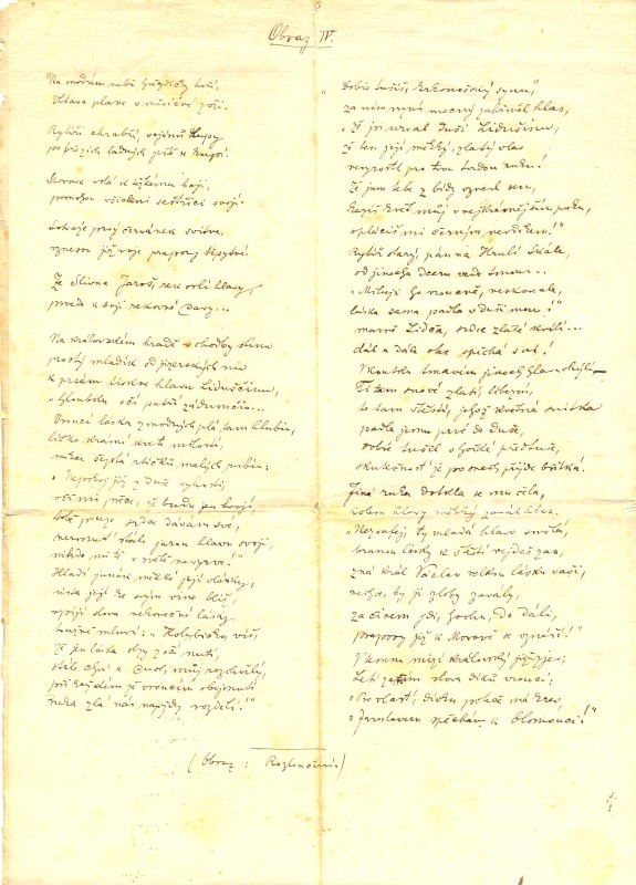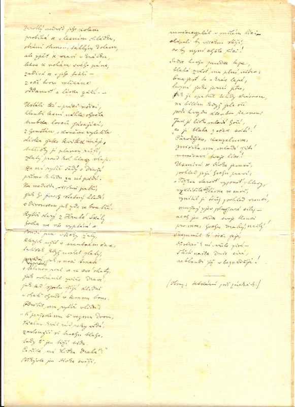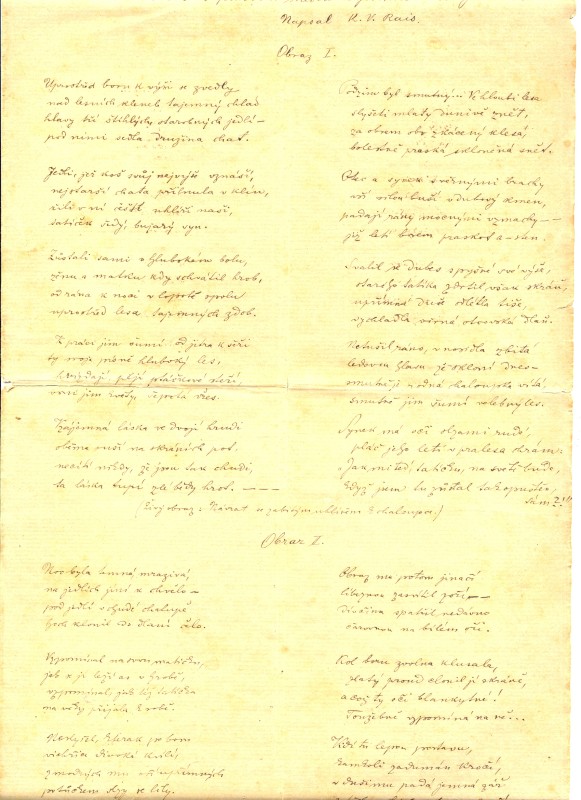 Vysoké n.J. Dopis K.V. Raise s přílohou básně pro živý obraz srazu rodáků 1885. Pověst o původu města Vysokého nad Jizerou. Rkp 8 s. Vysoké n.J., Muzeum Rk 61/S 261. Strana 1.
