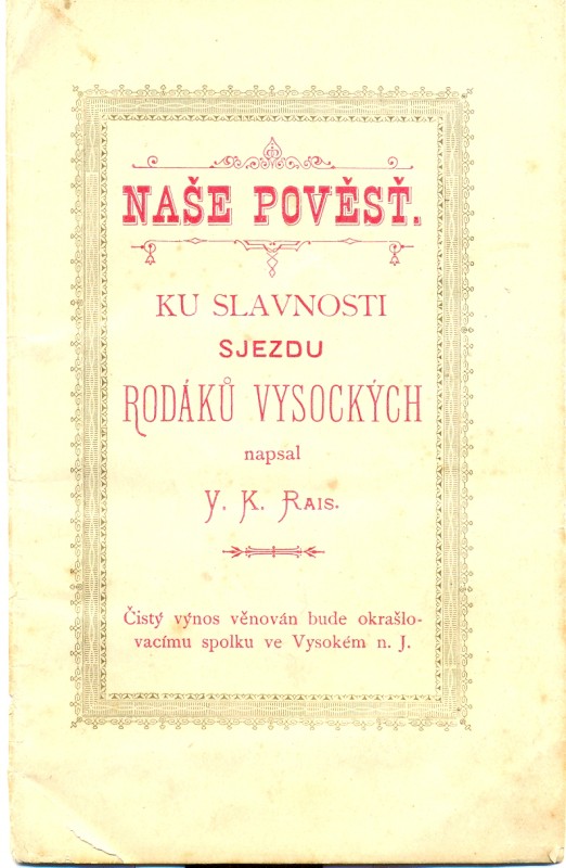 Rais K.V.: Pověst o původu města Vysokého nad Jizerou. Tisk 1885. Inscenována se 6 živými obrazy. Tit. strana. Vysoké n.J., Muzeum OP Rais K.V.