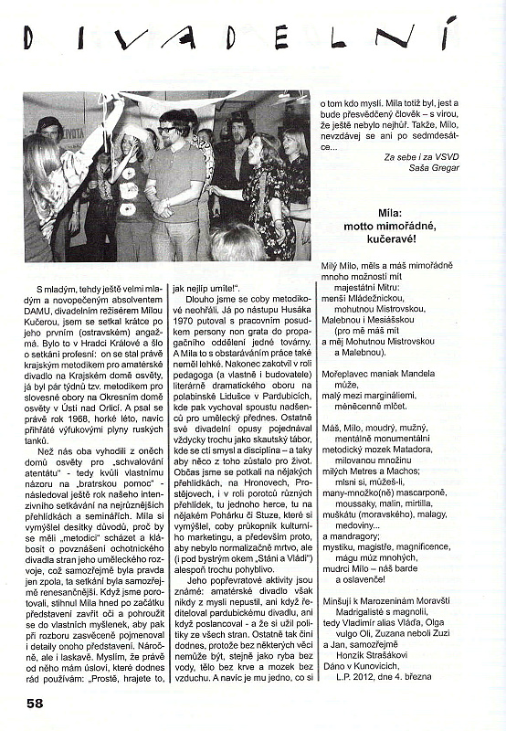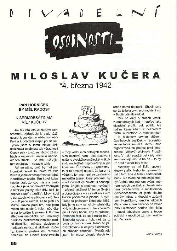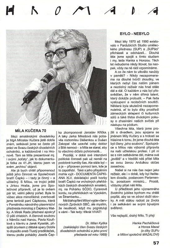 "Třeba když přijal můj scénář z poemy „Slovo“ Miroslava Válka. V duchu autorových odkazů byl rozšířen o citace z K. Marxe a W. Shakespeara a jinde zas přiměřeně krácen. To podstatné tam ovšem zůstalo (např. „Ne. Řády ne. Lesk kovu, hedváb stužky.../ A potom doma vzlykat do podušky/ ze studu?“). Nastudovaly to tenkrát čtyři kolektivy: v Ústí n. L. (R. Felzmann), v Praze (L. Marešová), v Pardubicích (M. Kučera) a v Čelákovicích (já). Bez komplikací inscenace prošla pouze v Pardubicích. Míla totiž poslal pozvání na premiéru autorovi (tehdy ministru kultury) do Bratislavy. Samozřejmě se nezmínil o tom, že pan ministr má ve scénáři spoluautory. A ministr samozřejmě nepřijel, ale samozřejmě se dopisem omluvil s přáním úspěchu. A Míla dopis samozřejmě přečetl před premiérou z podia."