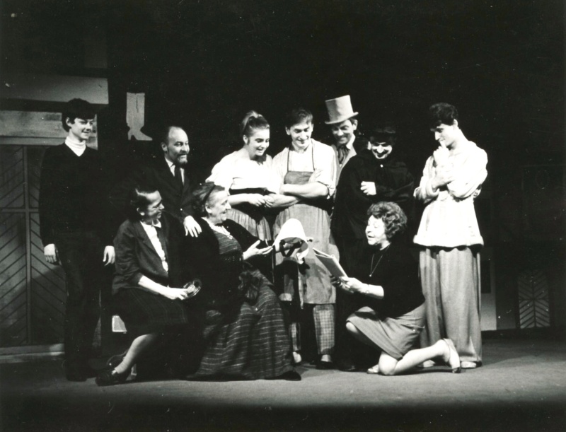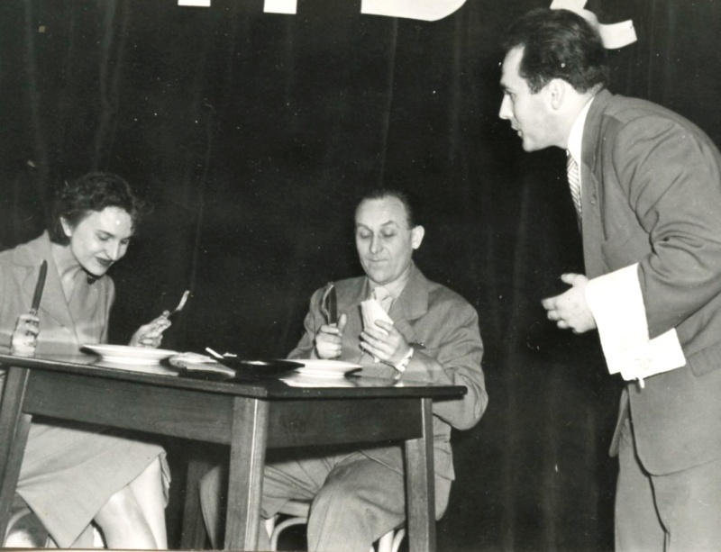Milan Kyška (uprostřed) v divadelní scénce při MDŽ podniku Elektrosignál - snad tedy "začátek divadelní kariéry"?, 1960
