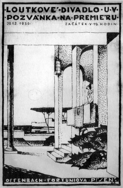 Umělecká výchova, LD: Pozvánka arch. Bohouše Buděšínského na premiéru Fortuniova píseň (Offenbach), 1930.