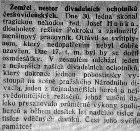 Dne 30. ledna skonal tragickou nehodou řed. Josef Huňka, dlouholetý režisér Pokroku a zasloužilý menšinový pracovník. Otrávil se svítiplynem, který nedopatřením nebyl dobře uzavřen. Dne 17. t. m. byl by se dožil osmdesátky. V zesnulém odchází jeden z nejlepších našich divadelních ochotníků, který dokonce jednou pohostinsky vystoupil na scéně pražského Národního divadla, jeden z nejnadanějších herců a nejsvědomitějších režisérů, jehož umění daleko přesahovalo průměrné výkony spoluherců a během desítek let nadchlo tisíce a tisíce vděčných diváků.