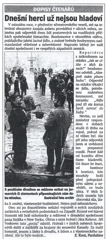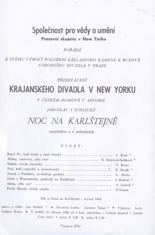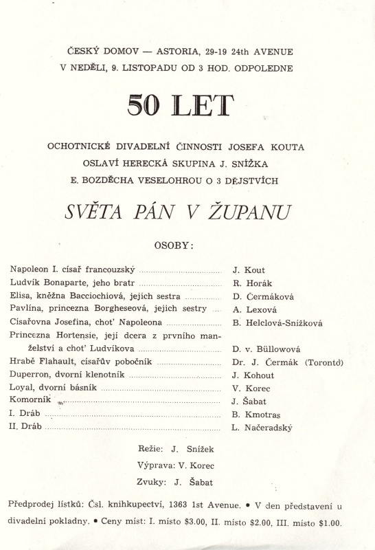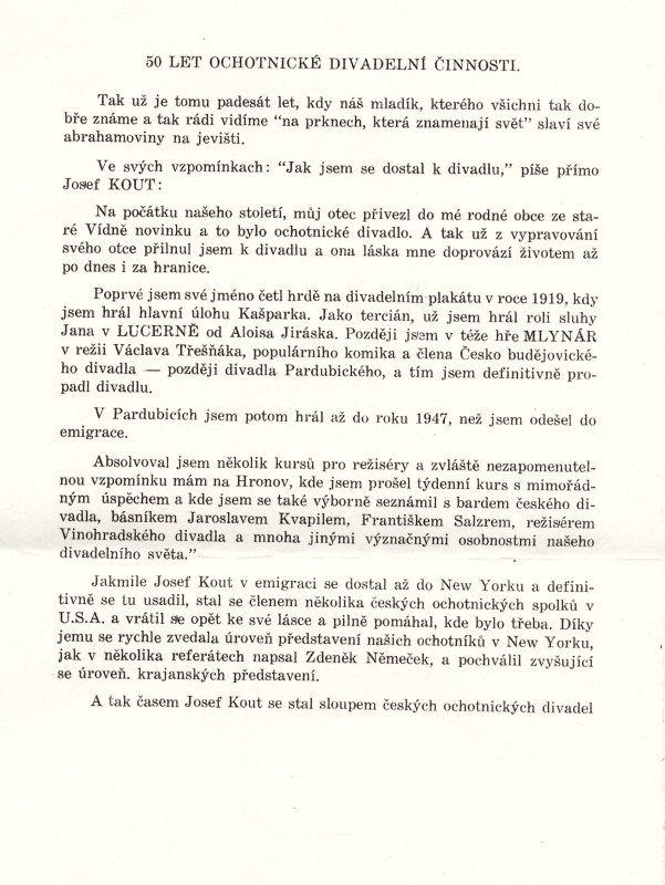 KOUT, Josef: Ze vzpomínky 50 let ochotnické činnosti, kterou otiskl (patrně v roce 1969) list Krajanského divadla v New Yorku. (Informace a materiály zaslal Zd. Kout, syn, Horní Vernéřovice-Jívka.)