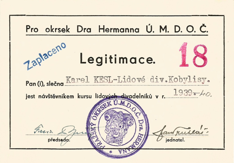 Zdroj: Soukromý archiv Karla Kesla věnovaný jeho dcerou pí Mílou Mandelovou Databázi českého amatérského divadla v roce 2021.