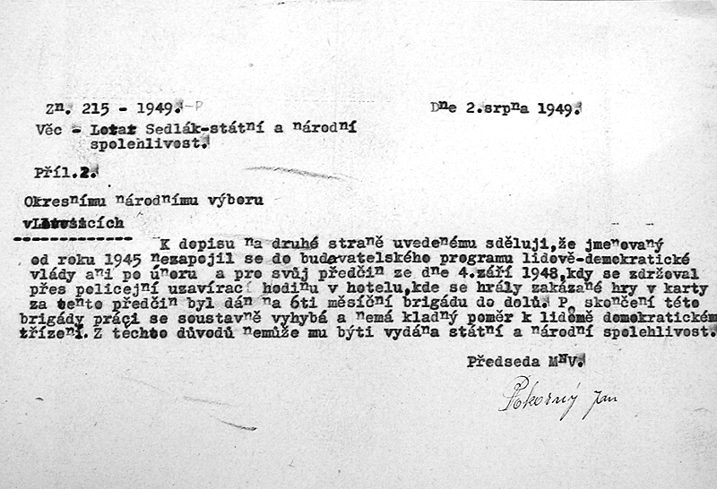 Následovalo období, kdy po dlouhých obtížích sehnal pan Sedlák zaměstnání v porcelánce v Klášterci nad Ohří a později nastoupil na dobrovolnou brigádu do uranových dolů v Jáchymově. Bydlel však nadále v Klášterci a do Libochovice za rodinou dojížděl 1x týdně; rodina zase naopak přijížděla za ním na prázdniny.