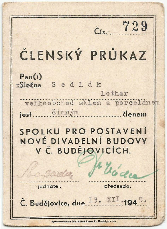 Zdroj: Pozůstalost pana Lothara Sedláka z Libochovic poskytnutá jeho vnukem Národnímu muzeu Praha, které pozůstalost postoupilo v roce 2023 Databázi českého amatérského divadla NIPOS Praha.