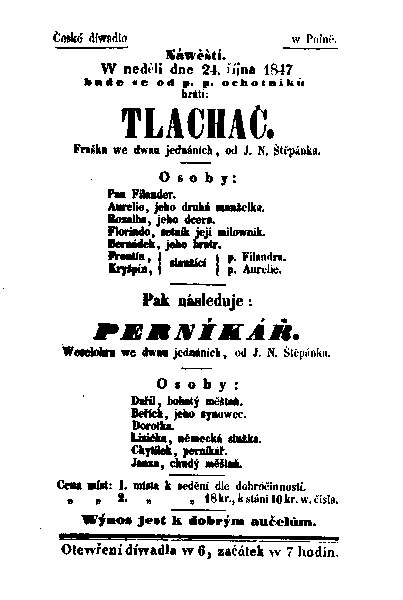 1847 Tlachač (Štěpánek; nejstarší dochovaná tištěná div. cedule), Pernikář, Jeden jako druhý (Kotzebue), Paní Marjánka, matka pluku (zhudebněná Jos. Kuhnem a Ant. Klusáčkem).