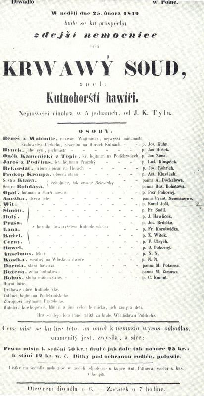 1848 4 hry. Ustavení pobočky Slovanská lípa. V divadle zah. Únos milenky aneb Všichni na poště (F. Huber), poté Ponocný (Tomsa), výtěžek na zřízení hudby polenské Národní gardy, Krvavý soud aneb Kutnohorští havíři aj. Nový div. řád činnost ochotnického divadla znesnadnil.
