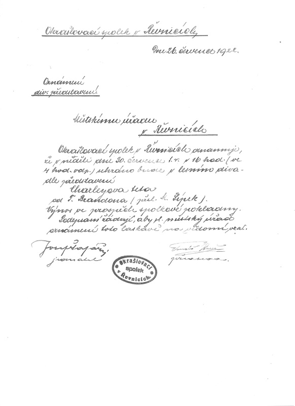 Řevnice, Okrašlovací spolek, Charleyova teta, 1922