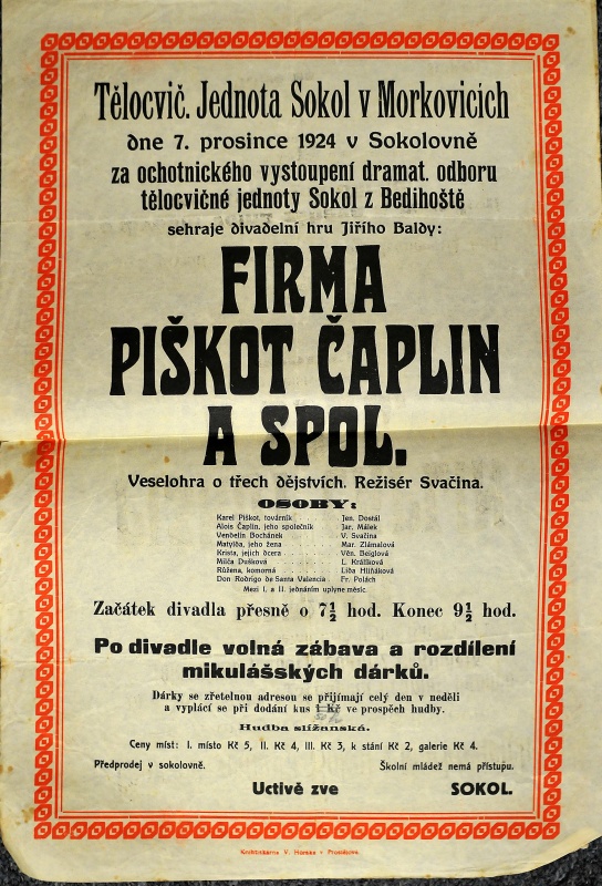 Bedihošť, Sokol, Firma Čaplin, Piškot a spol - plakát, 1924