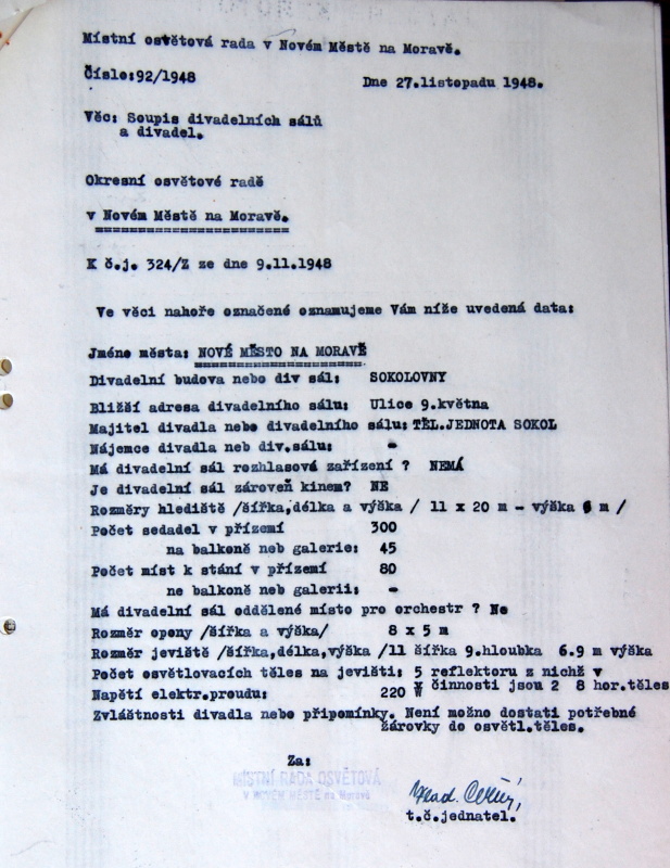 Zdroj: SOkA Žďár nad Sázavou, Okresní vedení veřejné osvětové služby Nové Město na Moravě, Povolování divadelních her, koncertů, … inv.č.2 Foto Jiří Němec říjen 2009