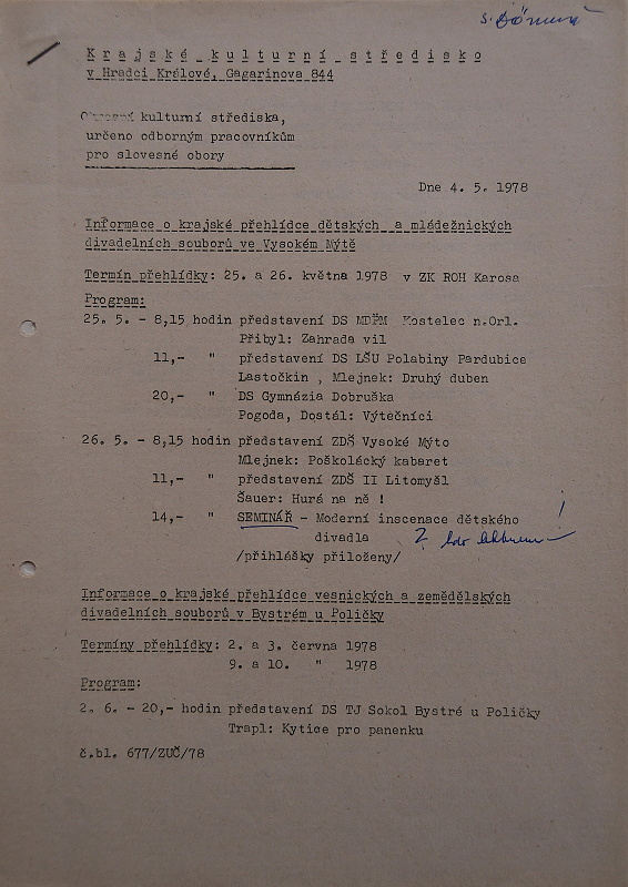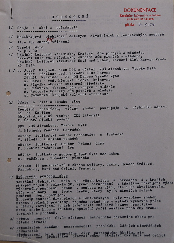 - Hradec Králové, Krajské kulturní středisko, Impuls, Vysoké Mýto, Mezikrajová přehlídka dětských divadelních a loutkových souborů, 1977