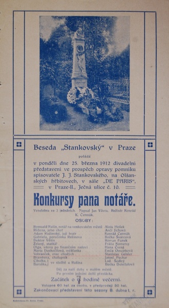 LADECKÝ, Jan: Seznam předmětů divadelního oddělení Národopisné výstavy českoslovanské roku 1895. In Příspěvky k dějinám českého divadla. Praha, Div. odbor NVČs 1895, s.180 - 193. Vystaveno: Podobizna J. J. Stankovského.