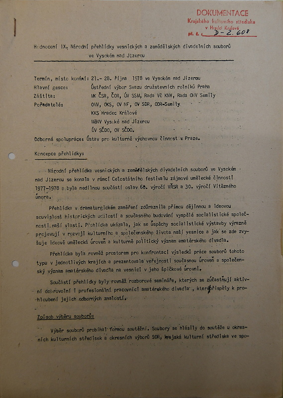 IX. NÁRODNÍ přehlídka vesnických a zemědělských divadelních souborů. Vysoké nad Jizerou 21.-28. 10. 1978. Programový leták. Vysoké n. Jiz., Přípravný výbor přehlídky 1978.
