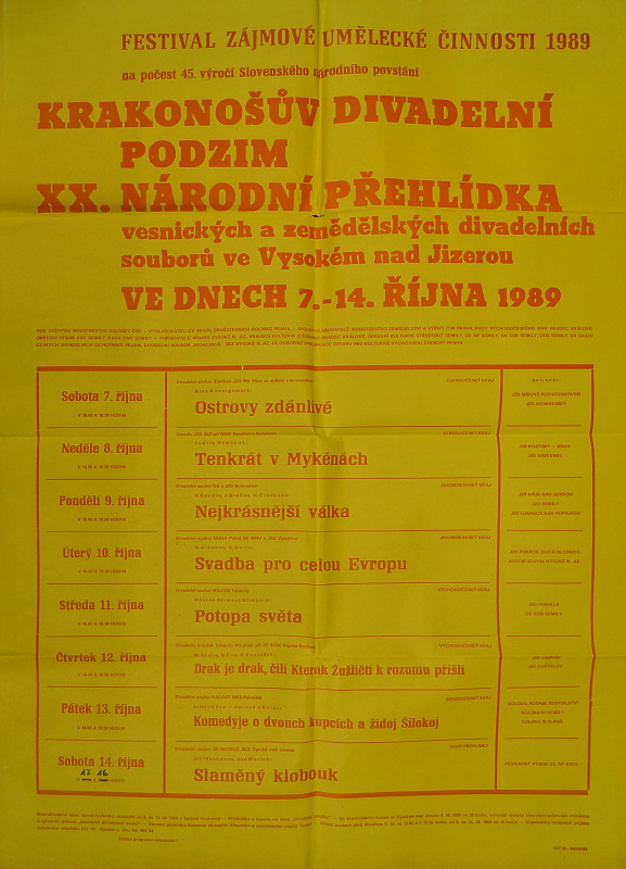 XX. KRAKONOŠŮV divadelní podzim. Národní přehlídka vesnických a zemědělských divadelních souborů. Vysoké nad Jizerou 7.-14. října 1989. Programová brožura. Vysoké n. Jiz., Přípravný výbor přehlídky 1989. 32 s.