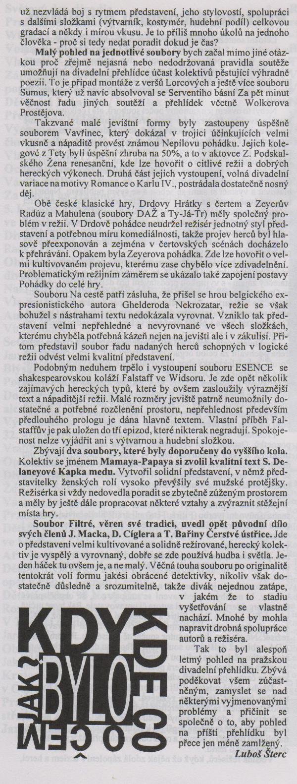 ŠTERC, Luboš: Pražská divadelní přehlídka. Amatérská scéna 1998, č. 2, s. 3-4.