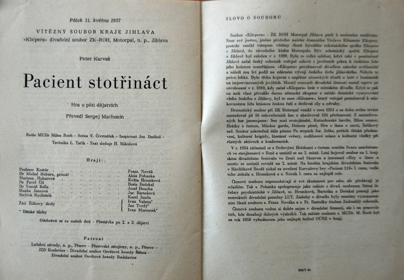 Jihlava, DS ZK Motorpal, Peter Karvaš: Pacient 113, r. MUDr. Milan Roch.