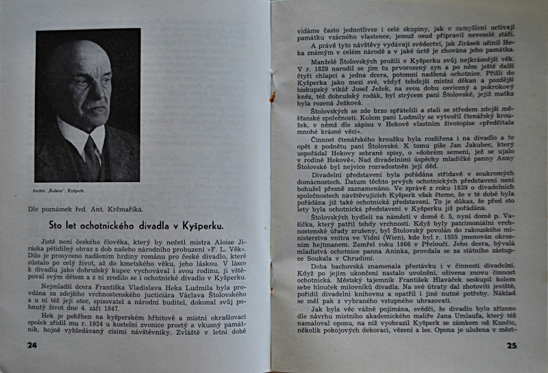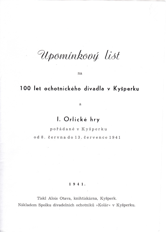 Upomínkový list na 100 let ochotnického divadla v Kyšperku a I. Orlické hry. (Tiskl Alois Otava, knihtiskárna Kyšperk, nákladem Spolku divadelních ochotníků "Kolár" v Kyšperku.)