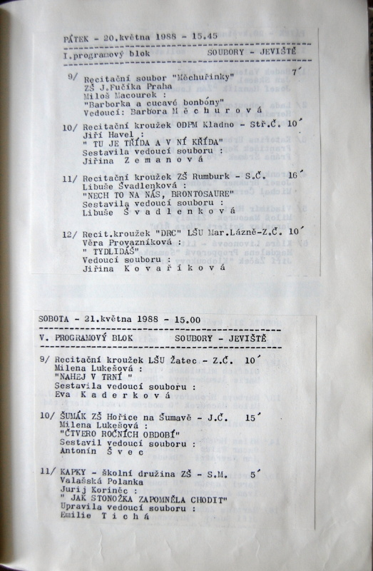 Kladno, Recitační kroužek ODPM, ved. Jiřina Zemanová, Jiří Havel: JE TU TŘÍDA A V NÍ KŘÍDA (pásmo sestavila Jiřina Zemanová).