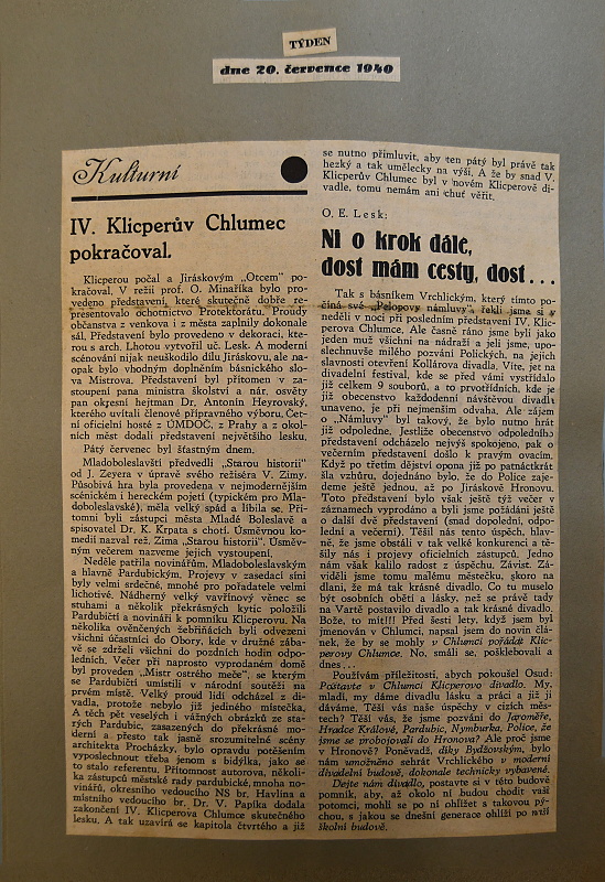 ČESKÉ SLOVO, 1940 - Zahajovací představení – na scéně IV. Klicperova Chlumce; Klicperův Chlumec; Společný zájezd novinářů z východních Čech na IV. Klicperův Chlumec; IV. Klicperův Chlumec – základ fondu pro postavení divadla v Chlumci n. Cidl.; IV. Klicperův Chlumec skončen, 1940; Potřeby divadelní budovy v Chlumci n.C.,1940; Zakončení IV. Klicperova Chlumce.