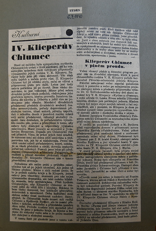 ČESKÉ SLOVO, 1940 – Před IV. Klicperovým Chlumcem; IV. Klicperův Chlumec – pod záštitou města Hradce Králové; Klicperův Chlumec. zahájen – vzorný slavnostní program; IV. Klicperův Chlumec – působivé plakáty chlumeckého výtvarníka; Slavnosti pokračují – v Chlumci zítra nejlepší ochotníci ÚMDOČ; Památný Chlumec volá!