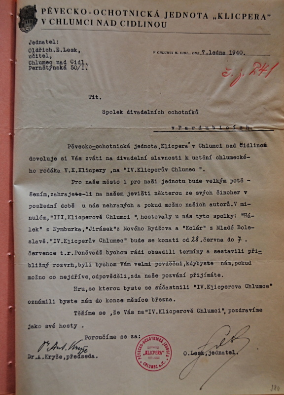Pardubice, Spolek divadelních ochotníků, Korespondence, 1940