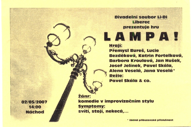 2007 - Li-Di, ved. Pavel Skála, Lampa. Účast KP Modrý kocour, Turnov - doporučení na NP NPS. Účast CP Náchodská prima sezóna. Účast na Náchodská Prima sezóna, CP studentského divadla.