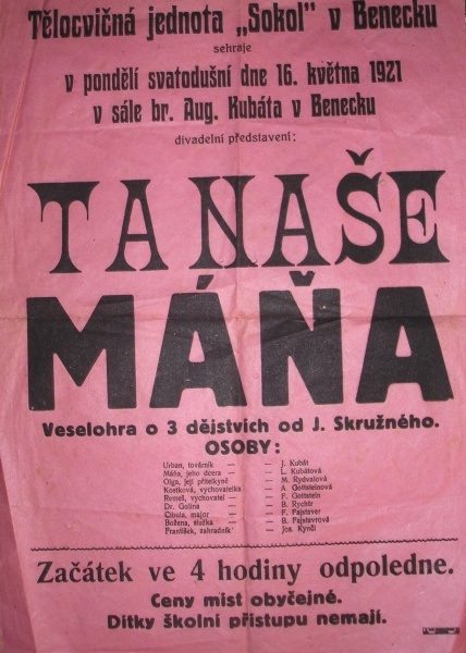 Za nepřízně počasí a v zimě se do přestavby 1936 hrálo i zkoušelo v hotelu Kubát (majitel byl Sokol i činný ochotník).