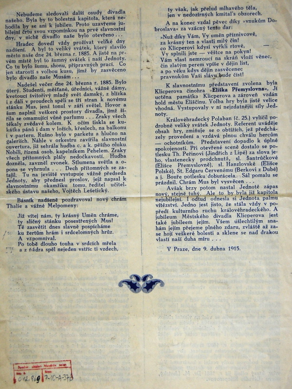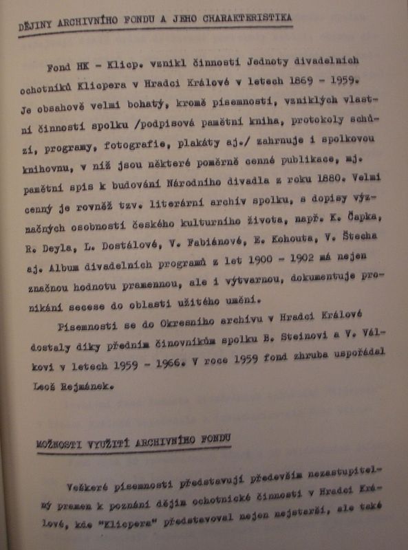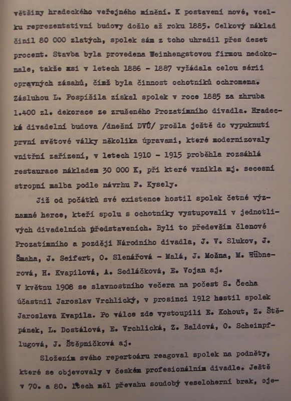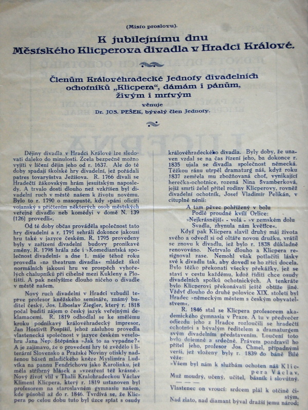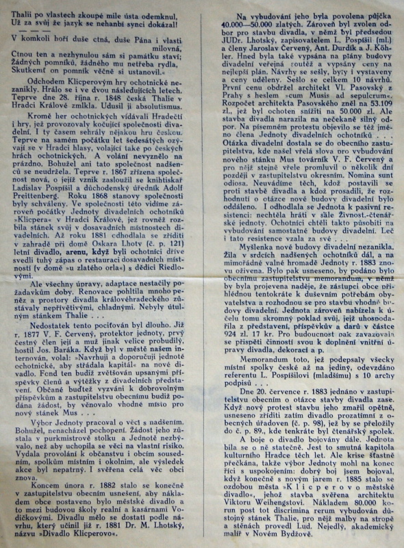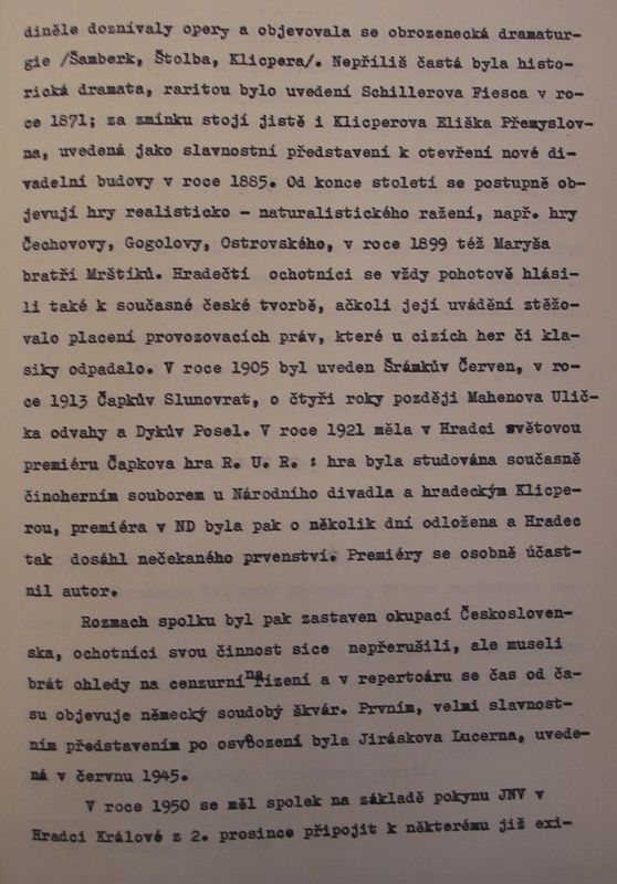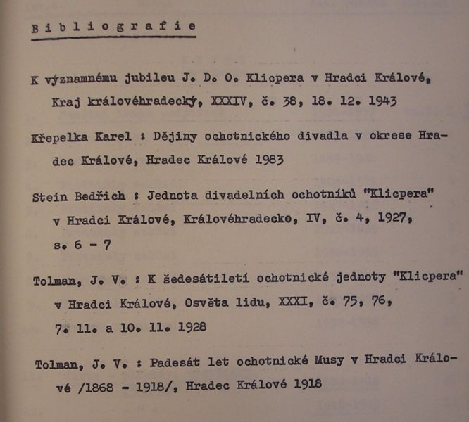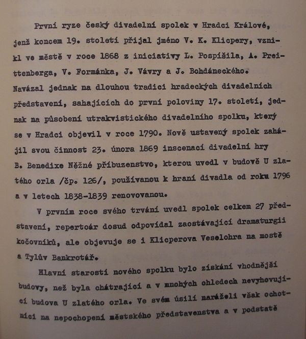 - Hradec Králové, Klicpera, Stručný nástin dějin ochotnického divadla v Hradci Králové, 1894