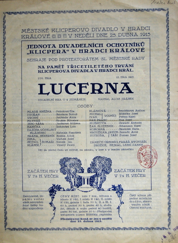 1917 Alois Jirásek: Otec; Jiří Mahen: Ulička odvahy, r. Miloslav Hruška; Otomar Schäfer: Kopřivy, r. Miloslav Hruška; Alois Jirásek: Otec, r. Miloslav Hruška; Václav Štech: Třetí zvonění; Alois Jirásek: Vojnarka, r. Jansta; Viktor Dyk: Posel, r. Jansta; Josef Štolba: Vodní družstvo; J. K. Tyl: Fidlovačka, aneb, Žádný hněv a žádná rvačka, s obrovským úspěchem, v okolí opakována 18x. Orchestr a zpěvy nastudoval a řídil Grucián Černušák (1882-1961, hudební historik a lexikograf, autor Čs. hudebního slovníku a Dějin evropské hudby).