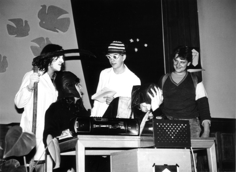 Tato, ale i většina dalších premiér proběhla při různých příležitostech v aule novopackého gymnázia, což dokumentuje i amatérský videofilm Báječní muži s kostrou (1990, režie Jiří Vávra).