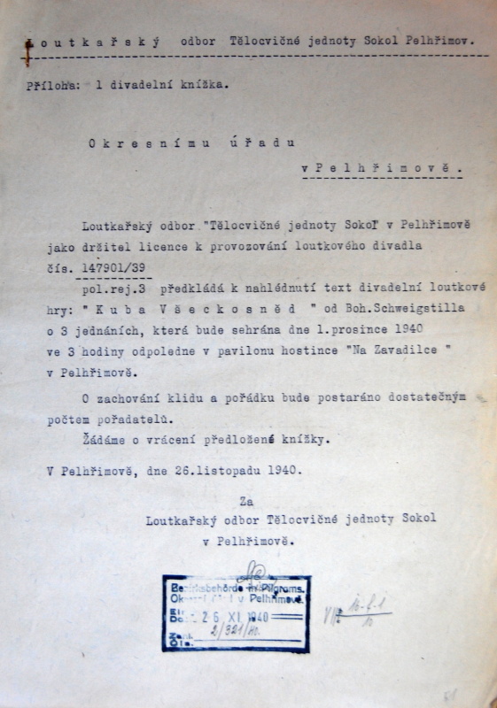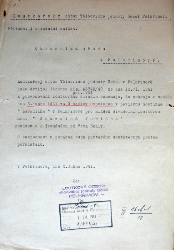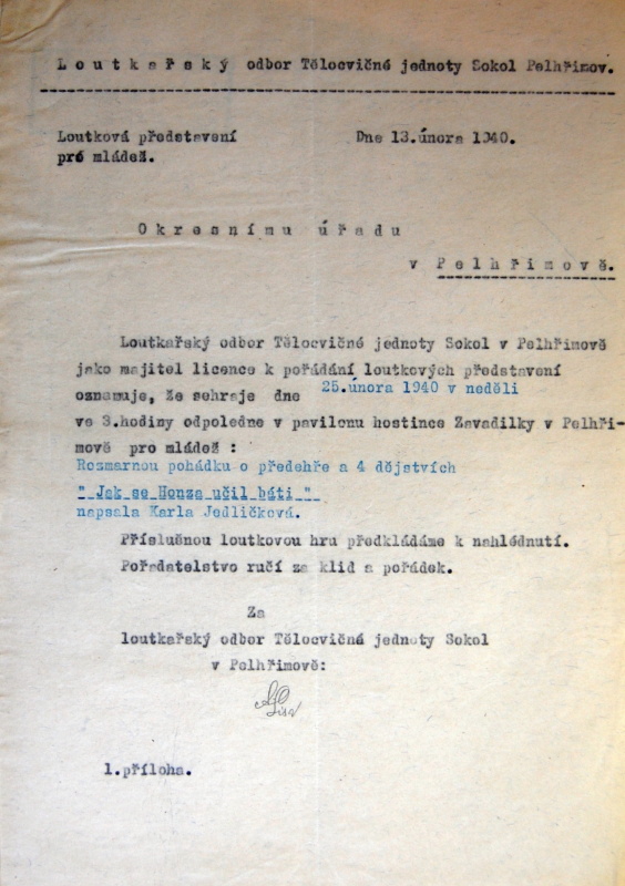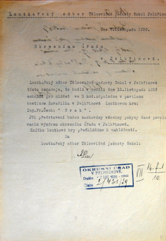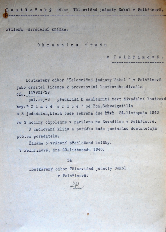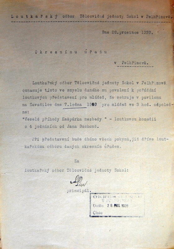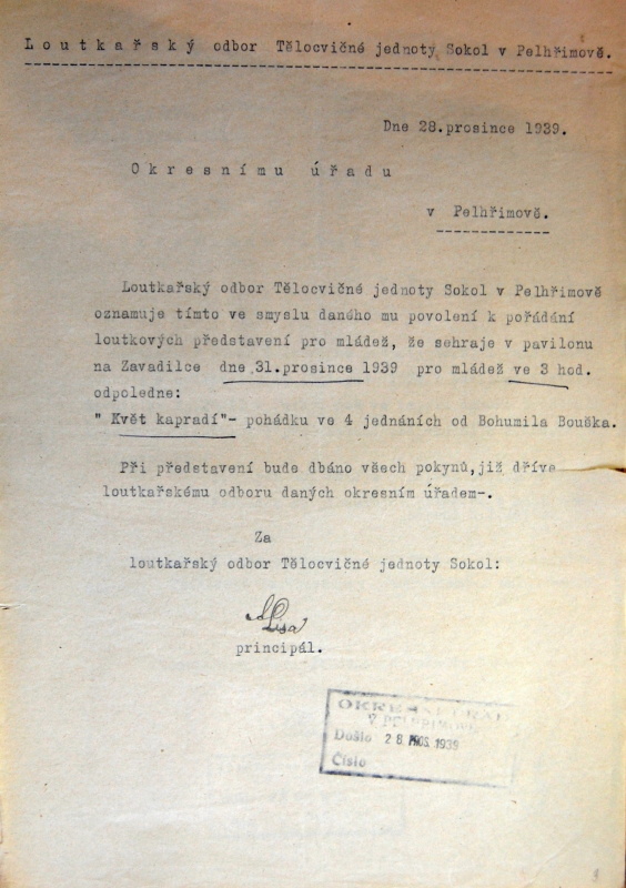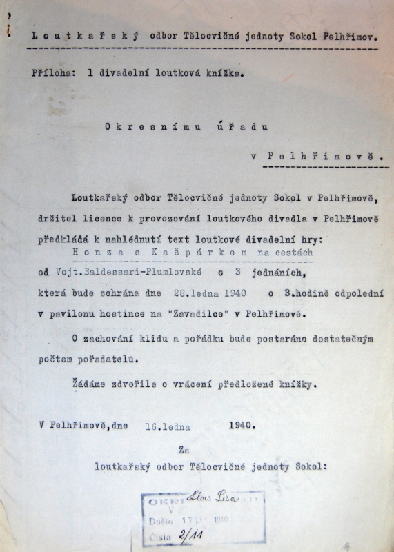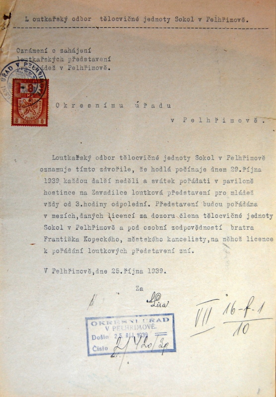 Pelhřimov, Solol LS, žádost o povolení loutkářské činnosti, 1939