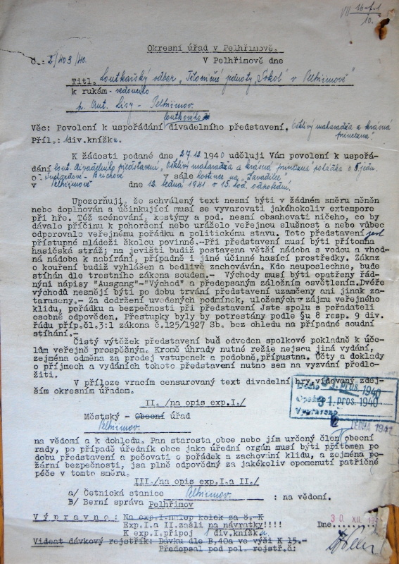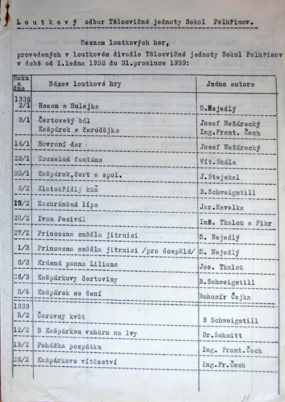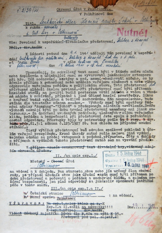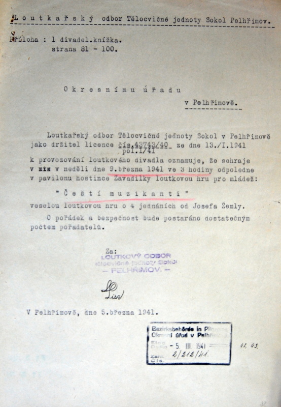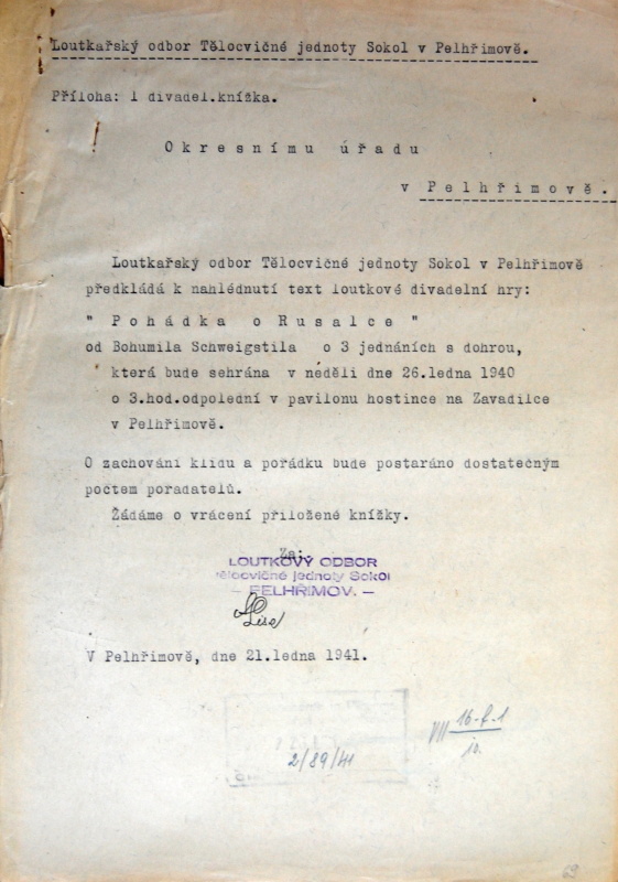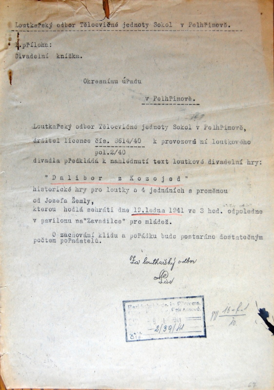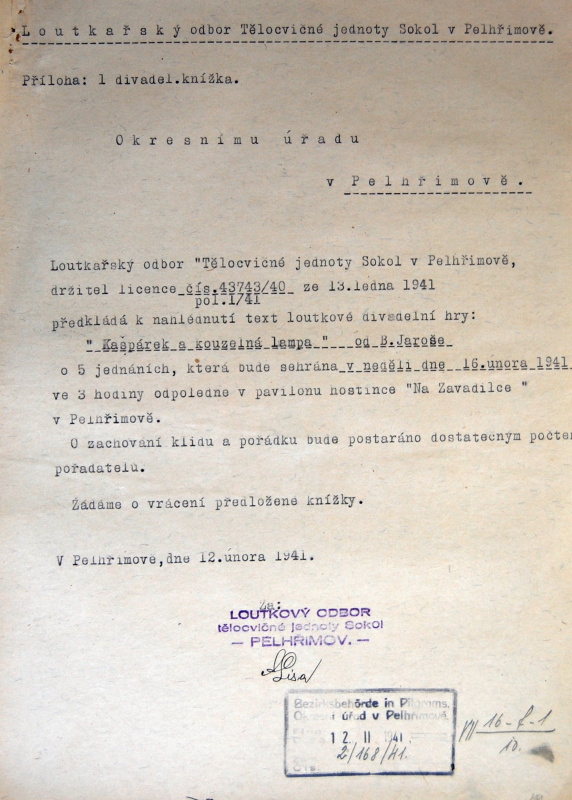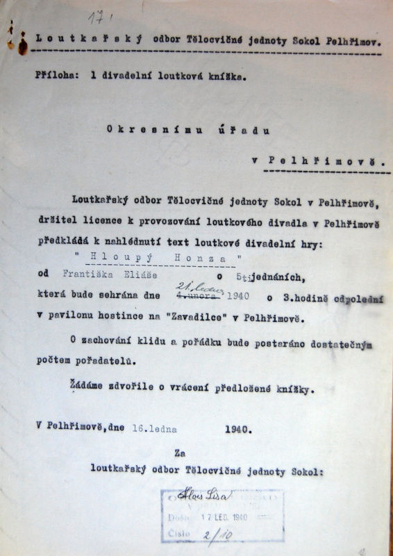 Pelhřimov, Solol LS, žádost o povolení loutkářské činnosti, 1939