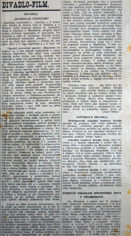Pelhřimov, Rieger, Mamzelle Nitouche, Sokol, Stříbrný pavouk, Lidové loutkové divadlo, Přijde k nám Ježíšek?, novinový článek, 1937