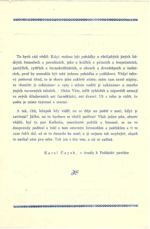1957 K. Čapek: Pošťácká pohádka, r. J. Karpaš a K. Freundl, návrhy loutek J. karpaš, provedení B. Koubek, kostymy M. Suchardová.