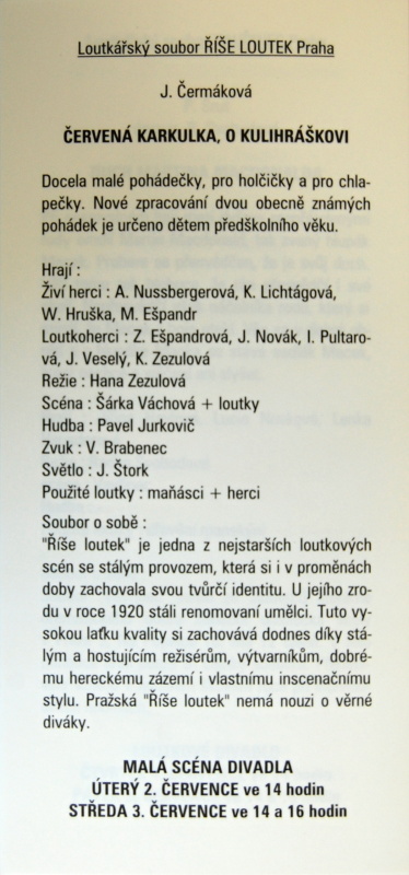 1996 - Jarmila Čermáková: Červená Karkulka, O Kulihráškovi. 1996 LCH. Účast na Čechova Olomouc 1997 - obě představení.