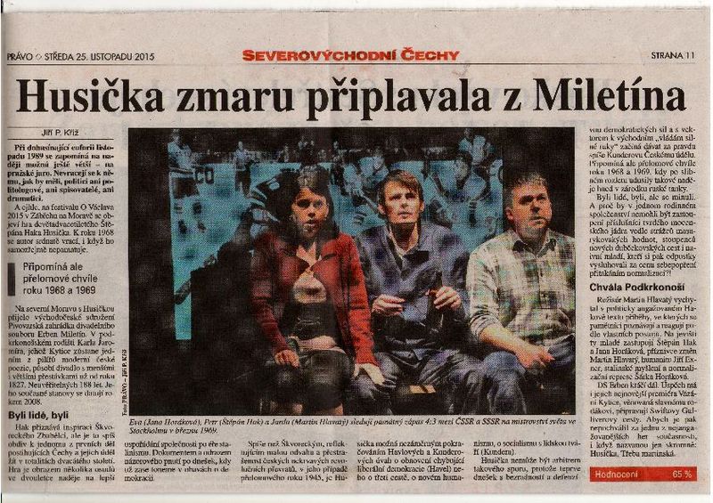 2013 - Pivovarská zahrádka při DS Erben Miletín, Štěpán Hak: HUSIČKA, režie Martin Hlavatý. Premiéra 26. 4.2013. Účast na přehlídce vyspělých DS, XLII. Symposion 2013. Účast na KP Jizerské oblasti, Lomnice nad Popelkou 2014. Účast na KP Sněhový Brněnec 2014 - cena souboru za inscenaci a Štěpánu Hakovi za text a za herecký výkon v roli Petra a čestné uznání Janě Horákové za roli Evičky a Martinu Hlavatému za roli Jardy - doporučení na KDP. Účast na Dětenické divadlování 2014. Účast na O Václava z Václavova 2015. Účast na ObP Březnový festival ochotnických divadel Dolní Chabry 2015.