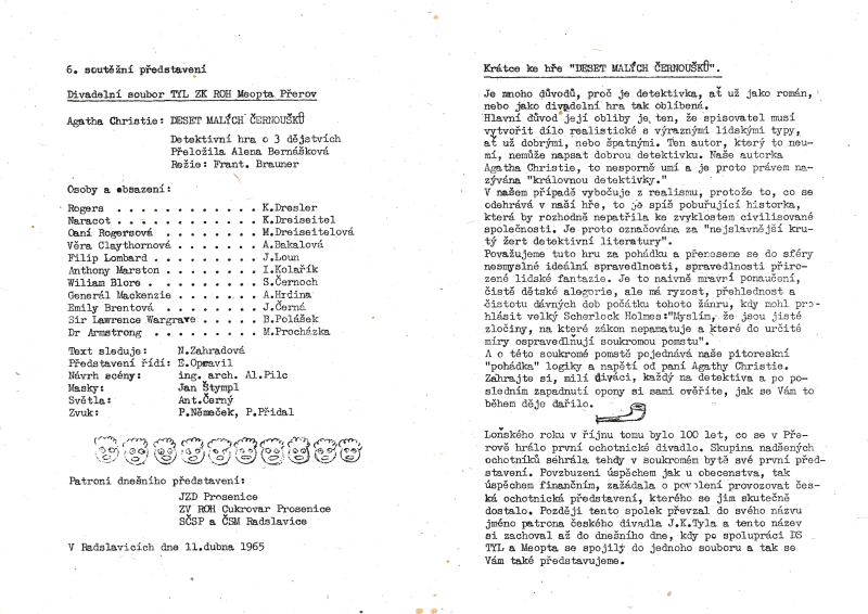 1965 - Agatha Christie: Deset malých černoušků. Účast v na OP v Radslavicích, v Napajedlích. Účast na Divadelní máj, Krnov - dobře hodnoceny herecké výkony.
