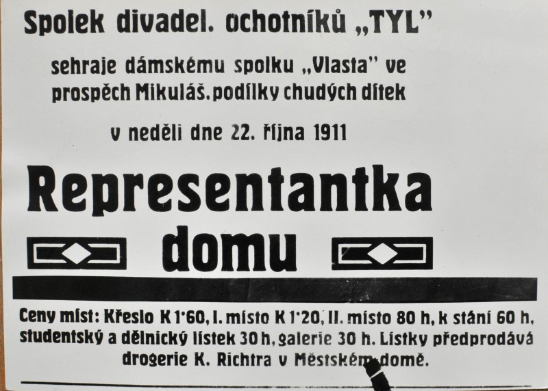 1911 pro dámský spolek Vlasta ve prospěch nadílky pro chudé děti sehrál Tyl hru B. Vikové-Kunětické Representantka domu. Dokladem toho, jak spolky usilovaly o získání (a vzdělávání) dělnického obecenstva, bylo poloviční vstupné společné pro studenty a dělníky. Sehrána ještě 4 představení - 25. a 26. 3. - P. Gavault: Čokoládová princezna, 9. 4. - Fr. Sokol-Tůma: Pasekáři, Al. Jirásek: Otec - slabý počet diváků proti předchozím letům. Hráno v sále Zaufova hotelu. Rozvažovány oslavy 50. výročí činnosti spolku.