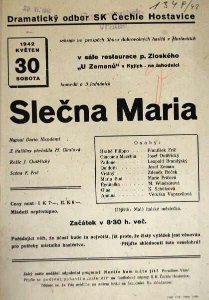 Mj. herci František Frič, Josef Outěřický, Leopold Brandýský, Josef Zeman, Marie Fričová, Zd. Roček, M. Windsorová, K. Schützová, Anna Gabrielová, K. Filípek, Rudolf Berný, Zdena Havlová, Jaroslav Kopecký
