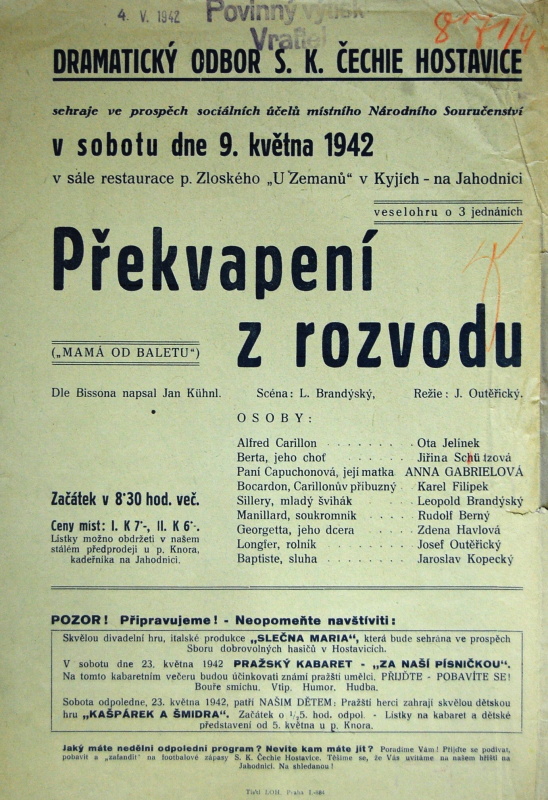 1942 Jan Kühnl: Překvapení z rozvodu, režie J. Outěřický, scéna L. Brandýský, D. Nicodemi: Slečna Mária, režie J. Outěřický, scéna F. Frič.